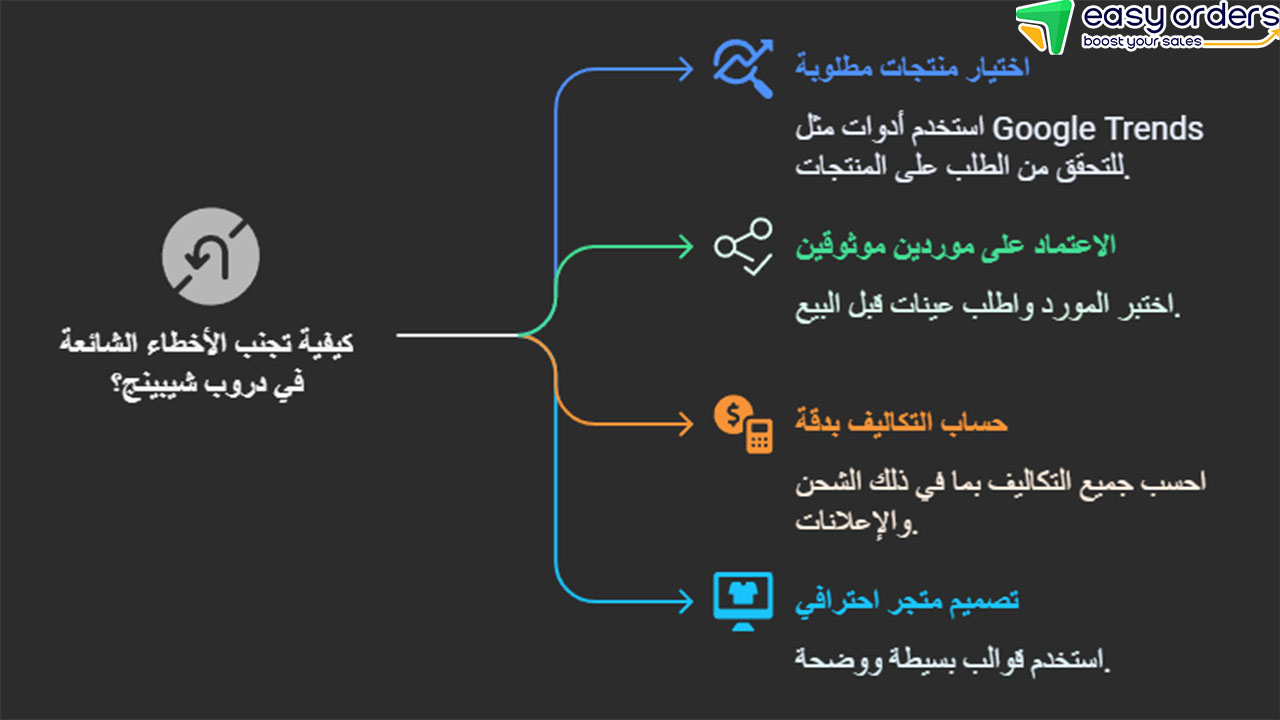 من أكثر أسباب فشل المبتدئين في الدروب شيبنج هو الوقوع في أخطاء متكررة ناتجة عن قلة الخبرة أو التسرع في التنفيذ. وبالتالي تجنب هذه الأخطاء من البداية يوفر عليك وقتًا ومالًا ويزيد فرص نجاحك. ولذلك سوف نوضح فيما يلي الأخطاء الشائعة وكيفية تجنبها في العمل:-